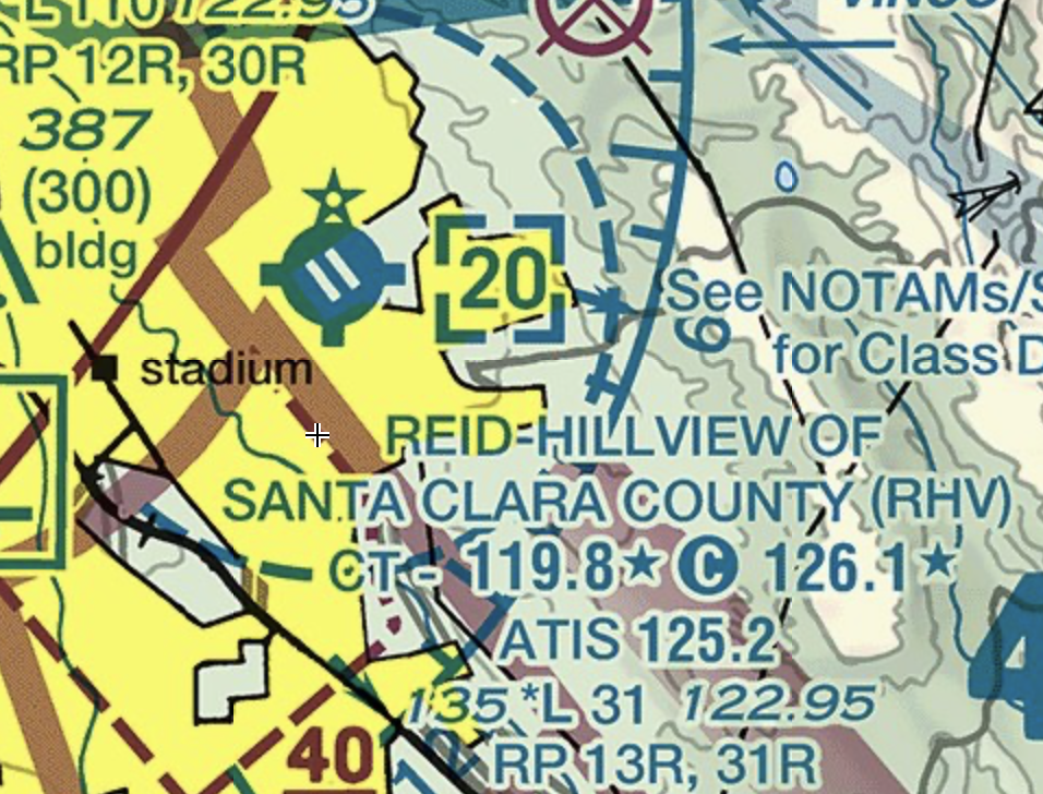 Our departing field, RHV Reid-Hillview, is in Class D airspace indicated by the dashed blue semi-circle. The 20 in the blue box brackets indicates the airspace extends from the surface to 2,000 feet