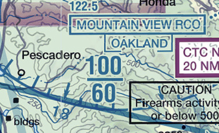 The bold blue 33 under Mountain View looks like a Bravo airspace altitude, but it’s something different. It’s the MEF (Maximum Elevation Figure) that lists the highest terrain or obstacle (in hundreds of feet) in this sectional tile. To clear the tallest thing in the tile, you must fly at least 3,300 feet. Note we’re flying at 2,500, which we can do but must be careful to review the terrain and obstruction elevations along our flight path.