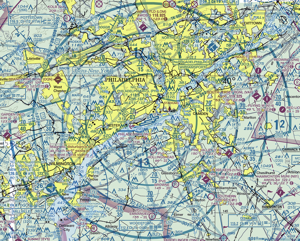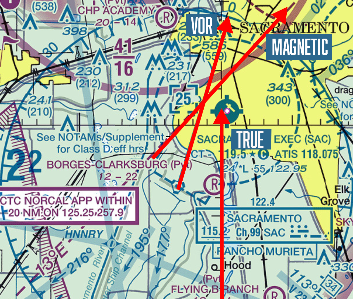 Bonus topic! See that 13 degrees E in the lower left? You probably know that if you hold a compass, it doesn’t point to the Earth’s North Pole, but instead points to magnetic north. This changes based on where you are on the planet because the Earth’s magnetic field is not uniform. The map is telling you that at this spot on the planet, magnetic north is 13 degrees east of true north . If you know how to read the VOR compass rose, it’s easy to see that the north arrow on the compass rose is tilted to the right of the North-South longitude line that passes through KSAC. VORs use magnetic north while sectional maps use true north.