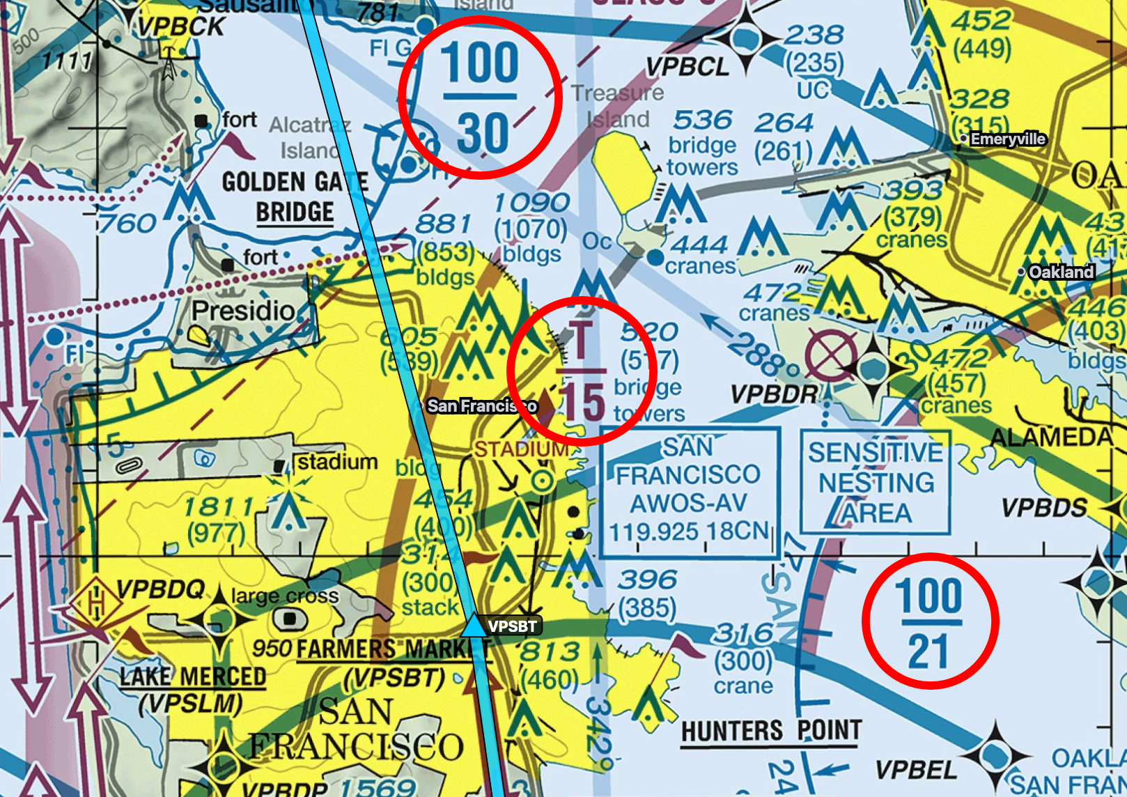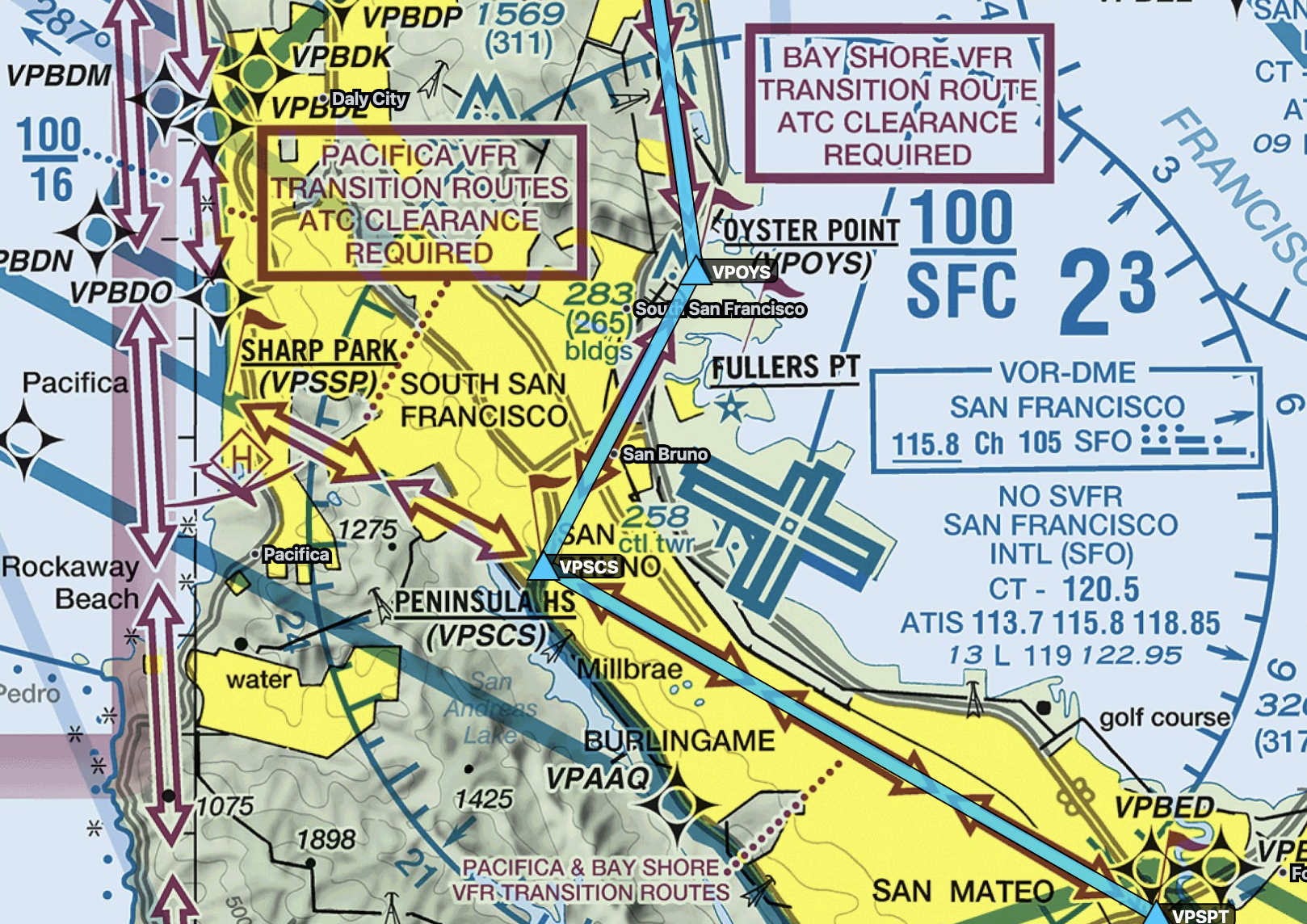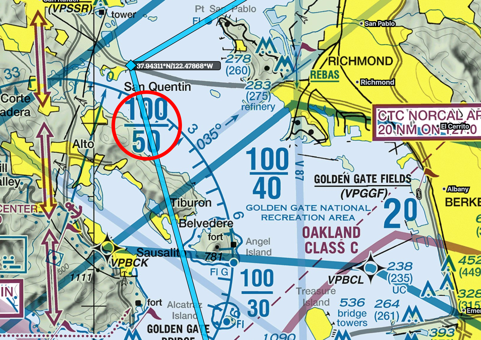 On the north side of KSFO, the Bay Shore Route concludes at Farmer’s Market. The Bravo shelf here is 2,100, increasing to 3,000 as we head north. Although it appears that we’re in the Oakland Class Charlie airspace based on the magenta T/15, this indicates the bottom of Oakland starts at 1,500 feet and ends at the start of the KSFO Class Bravo, wherever that may be. It’s written like that because there are two Bravo shelves overlaying this one Charlie segment, and each Bravo shelf has a different starting altitude.. It is worth noting that with us flying at 2,500, there is a short span after Farmer’s Market where the first 2,100 foot Bravo shelf ends and becomes the second 3,000 foot Bravo shelf. At that point, with us flying at 2,500 feet we have exited the Bravo and we are in the Oakland Charlie airspace that starts at 1,500 feet. Both Oakland and San Francisco use NORCAL Approach, so I’d guess the Approach controller would give me instructions, since they are the controlling authority.
