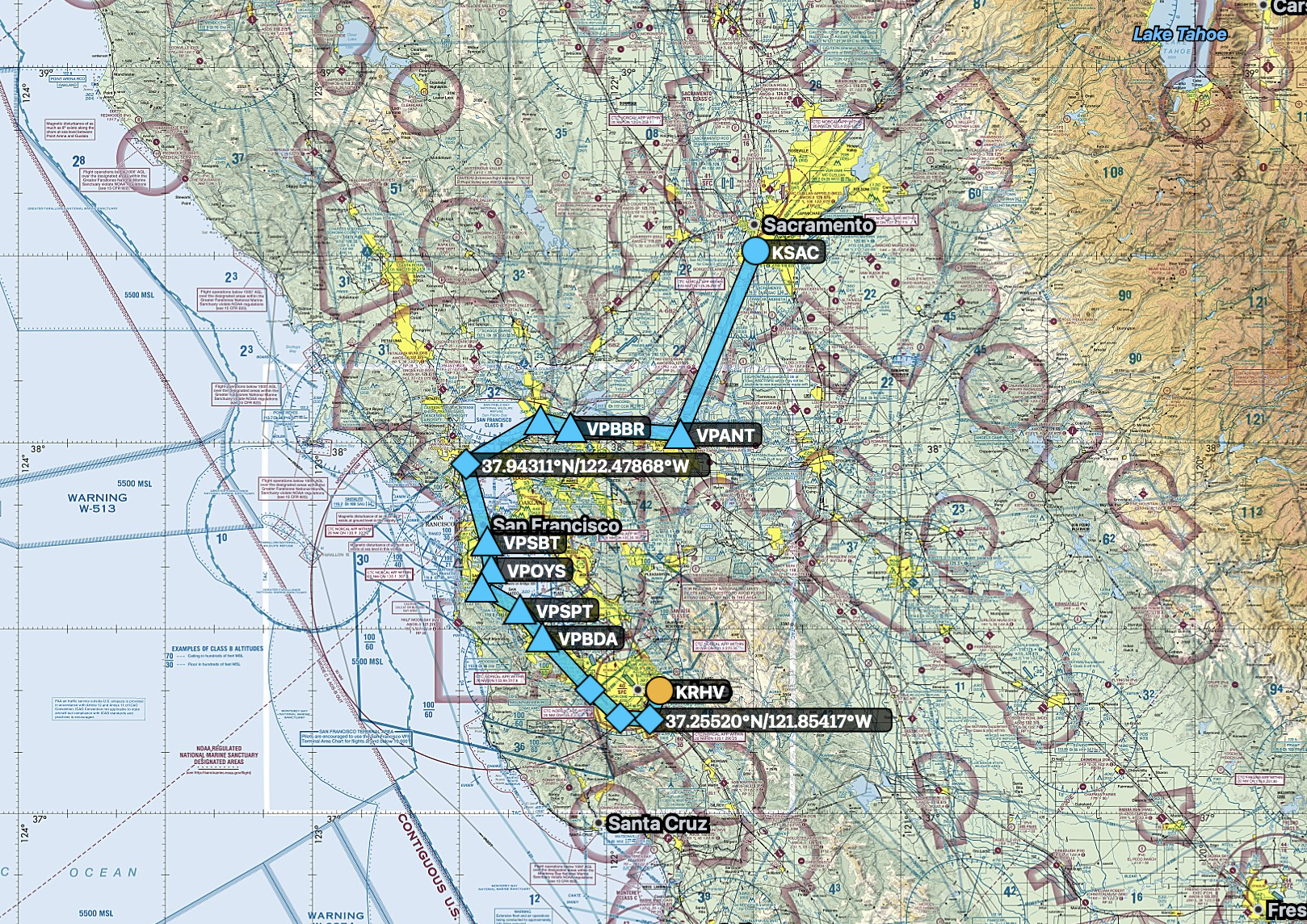 You can see we could just fly direct from KRHV to KSAC and avoid everything, but we’d miss out on the great views