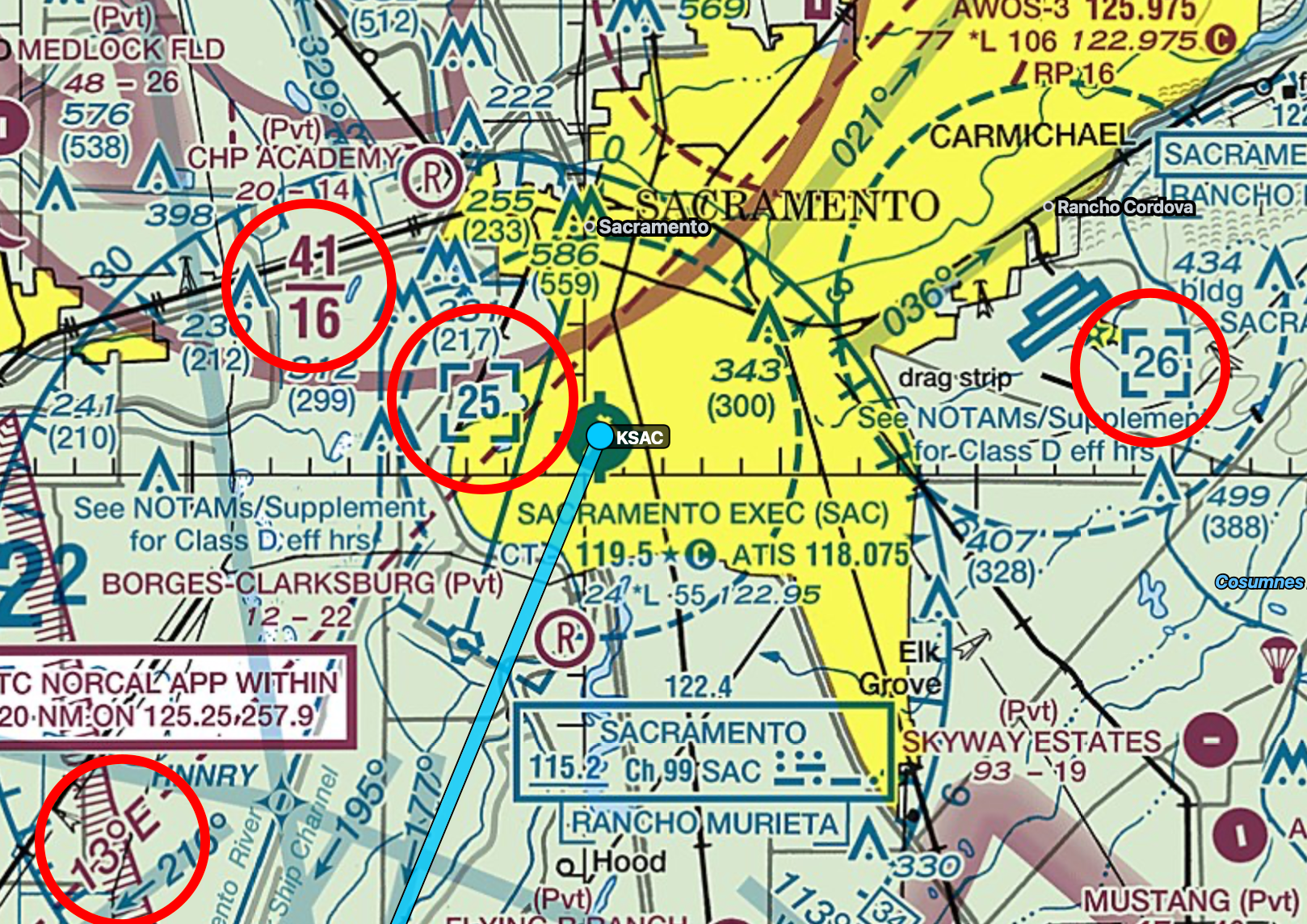 Now, we’ll just follow the bay bridges until the Antioch bridge, where we’ll follow the Sacramento River. This will be our cue to get the weather for KSAC San Francisco Executive, because Exec Tower will ask us for the ATIS code when we request landing. KSAC itself is a Class D, just south of the Class C of Sacramento and west of the Class D of Mather. From an awareness standpoint, if we end up on the north side of KSAC we’ll need to mind the 41/16 Class C shelf, which shouldn’t be a problem if we’re at traffic pattern altitude of 1,000 feet.