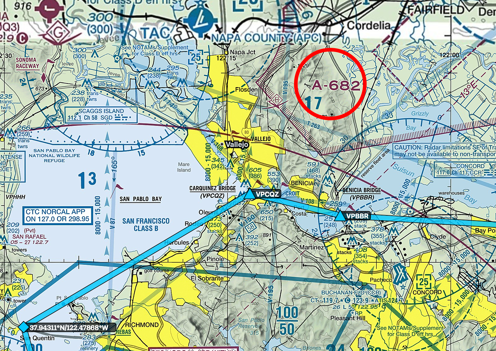 The hashed red polygon labeled A-682 is an Alert Area for Travis Air Force Base. We are free to fly in it without permission, but we should be, well, alert. It’s a warning that something like a high volume of flight training may be happening.