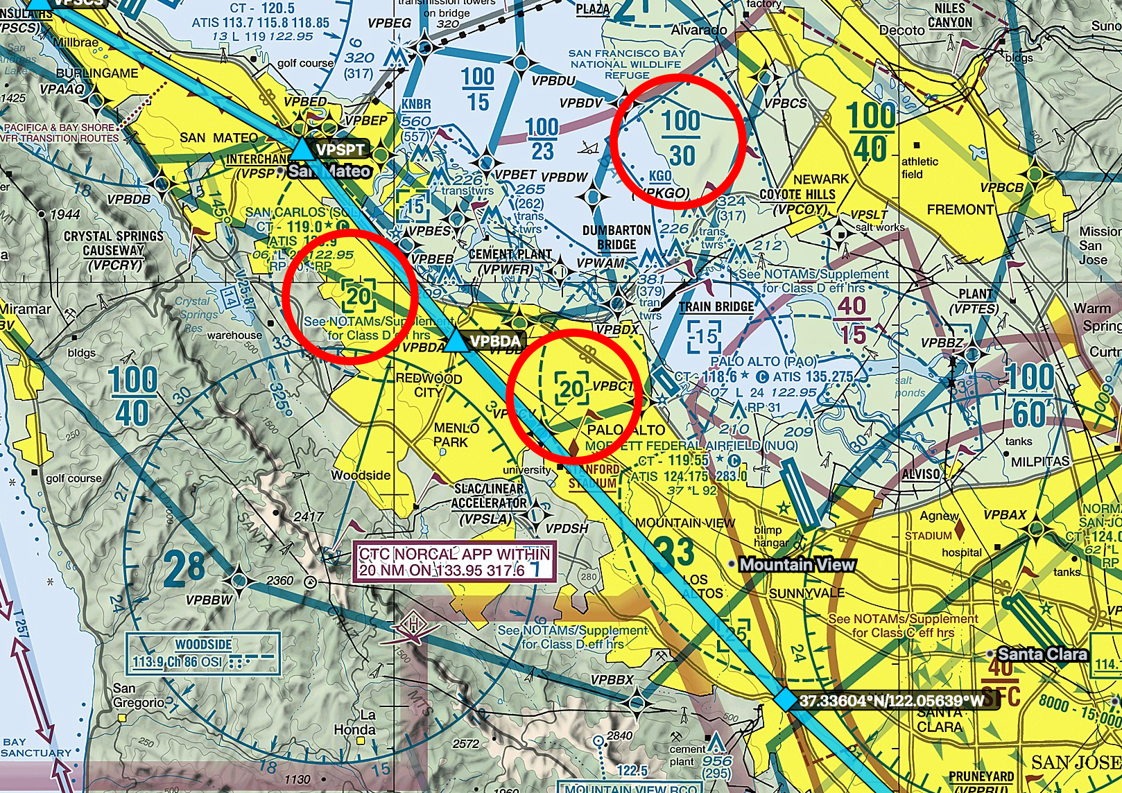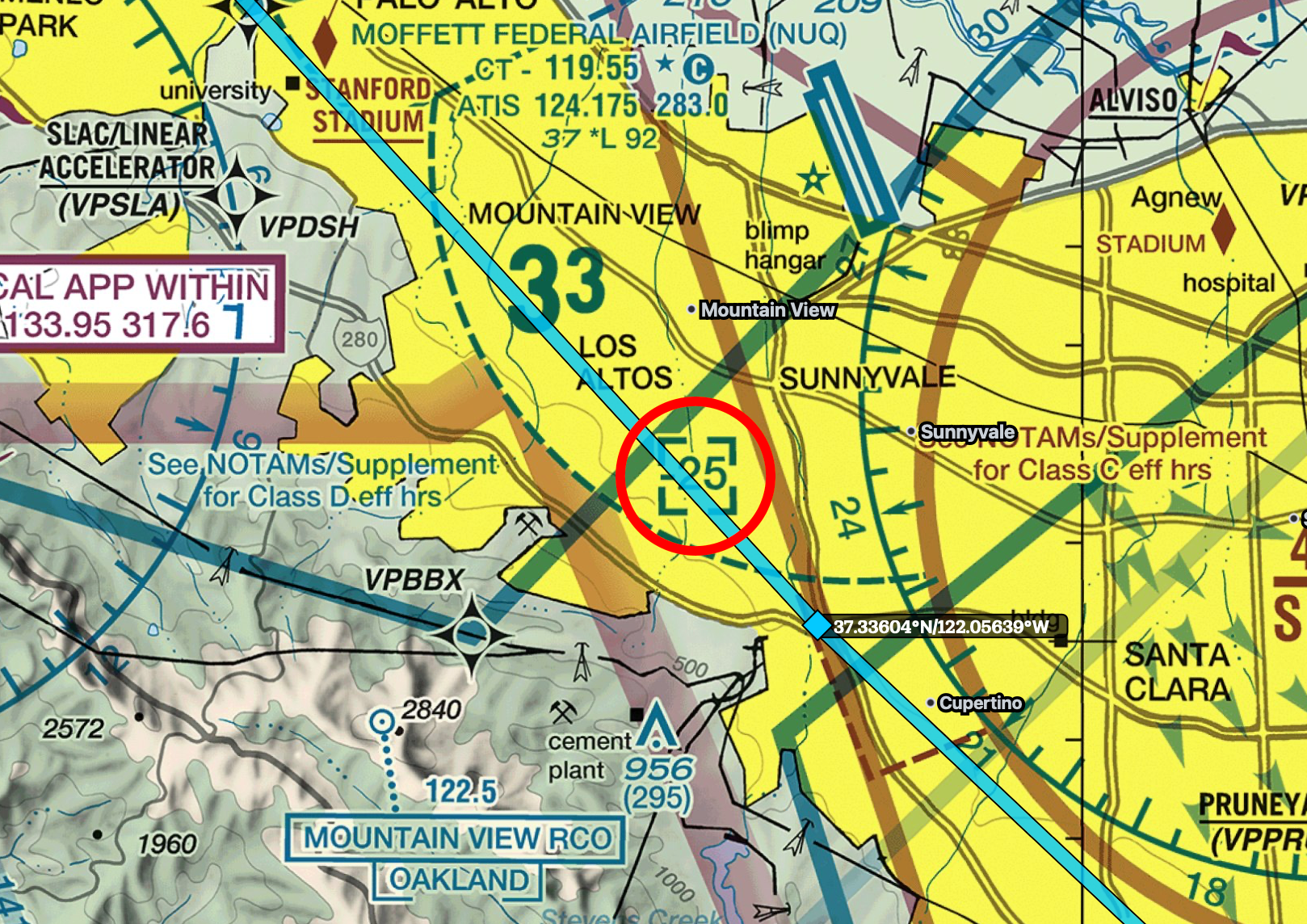We’ll also pass over KNUQ Mofffet’s Class D airspace. It’s hard to see in the screenshot below, but their airspace is listed as “-25” in a blue bracket, which means it extends from surface up to but not including 2,500 feet. So we’re just barely above it flying at 2,500 feet.