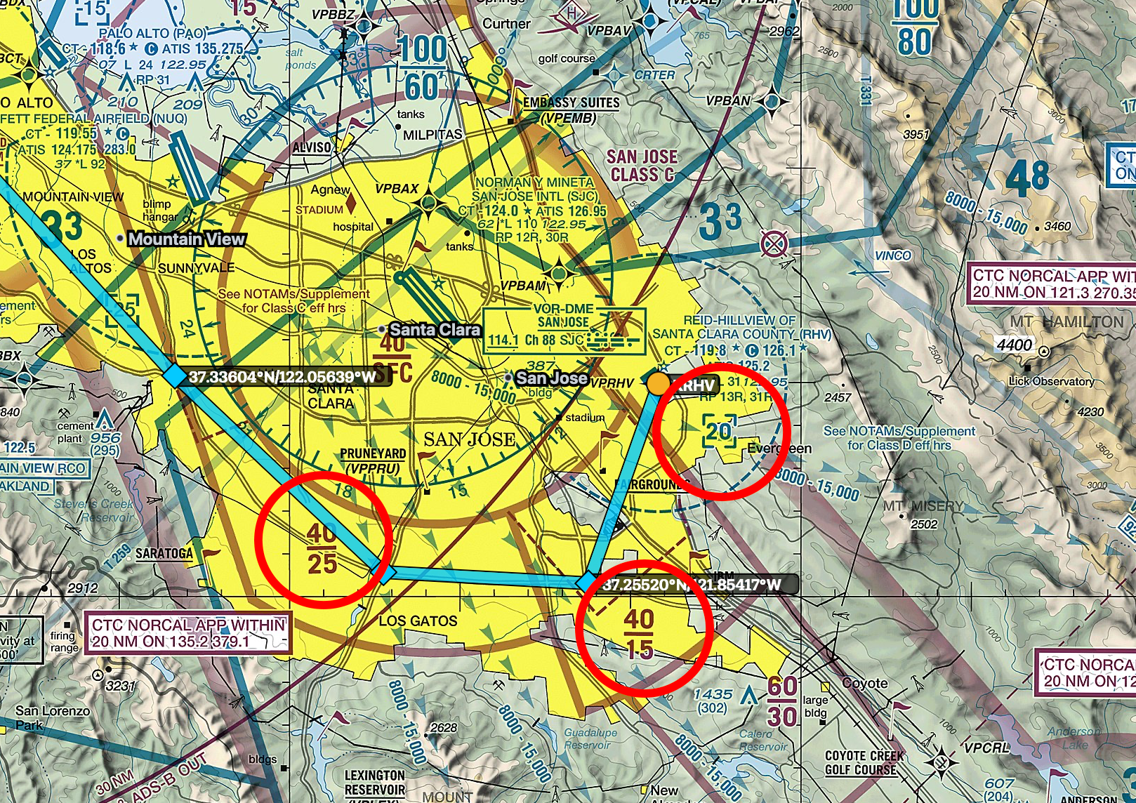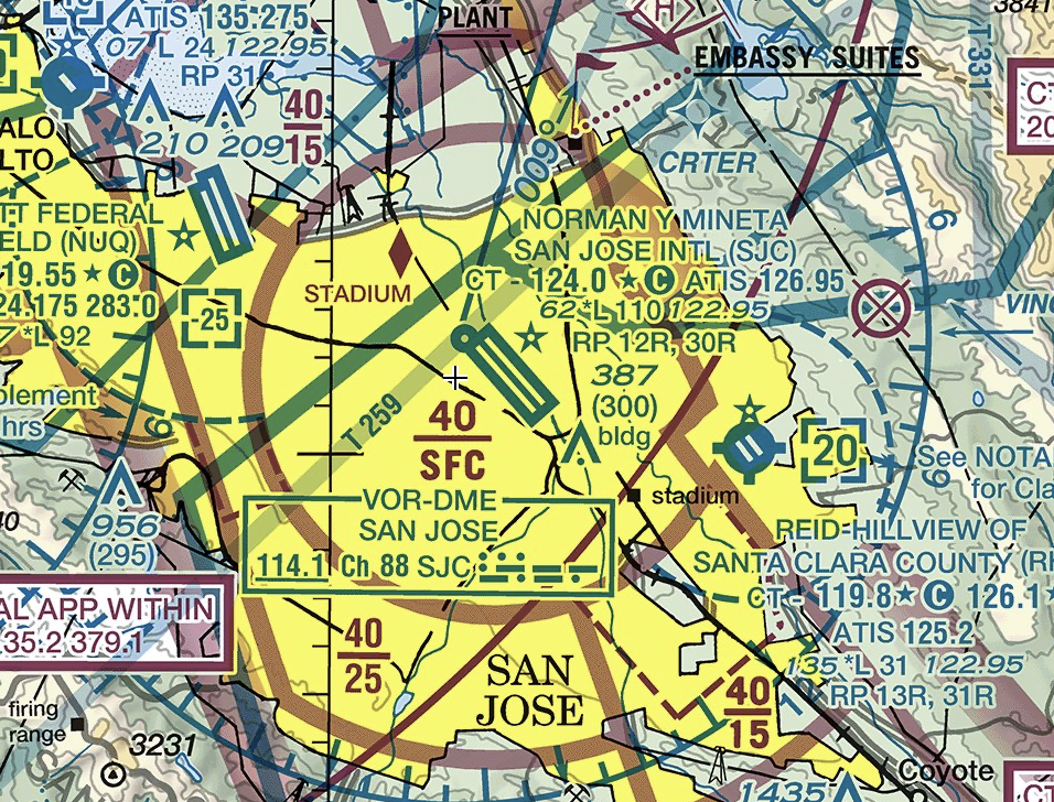 Solid magenta lines indicate KSJC San Jose’s Class C airspace. The dotted blue circle indicates KRHV’s Class D airspace. The fractions are top/bottom of airspace shelves in 100s, such as 40/25 = top of airspace at 4,000 feet and bottom at 2,500 feet.